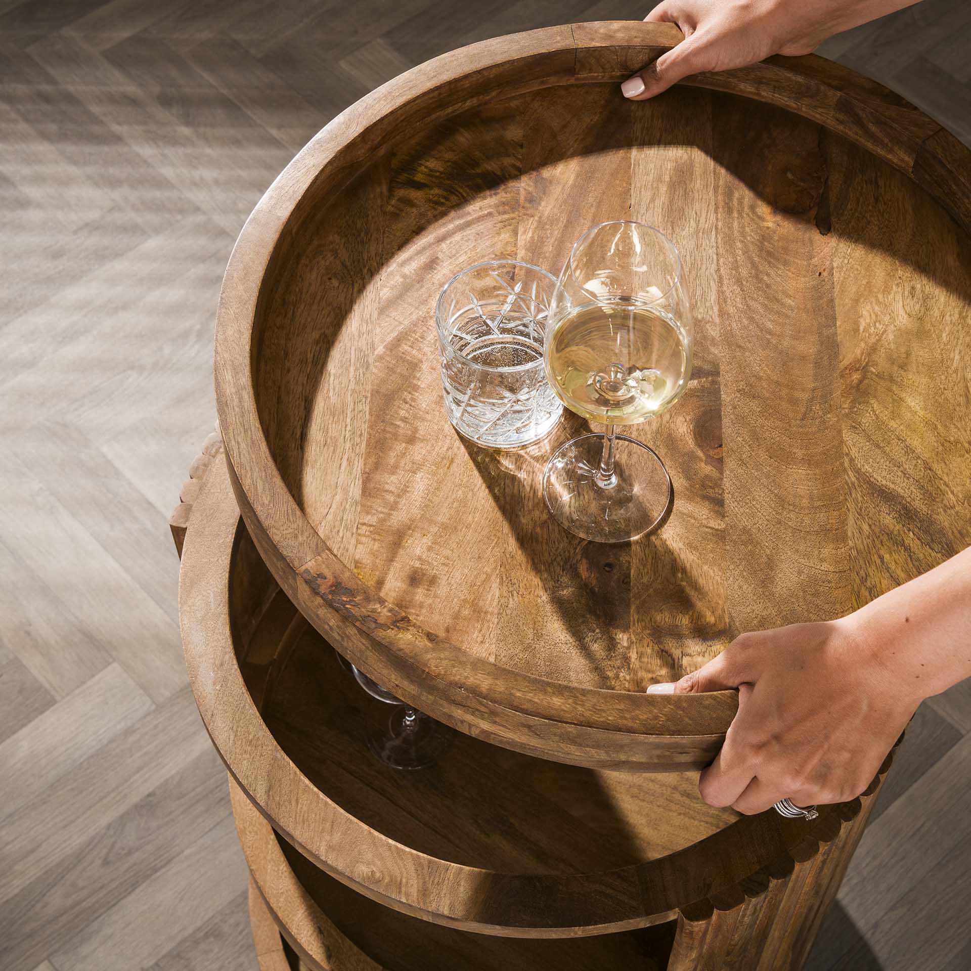 Combine atmosphere and functionality with this compact bar trolley in sand-colored Mango wood. The solid wood gives a warm, natural look that effortlessly fits into modern and industrial interiors. Thanks to the thoughtful design, you have a practical helper for drinks, coffee moments, or a cozy evening at home. The trolley offers space for glasses, bottles, and accessories, while you can easily move it to where the party is thanks to the wheels.