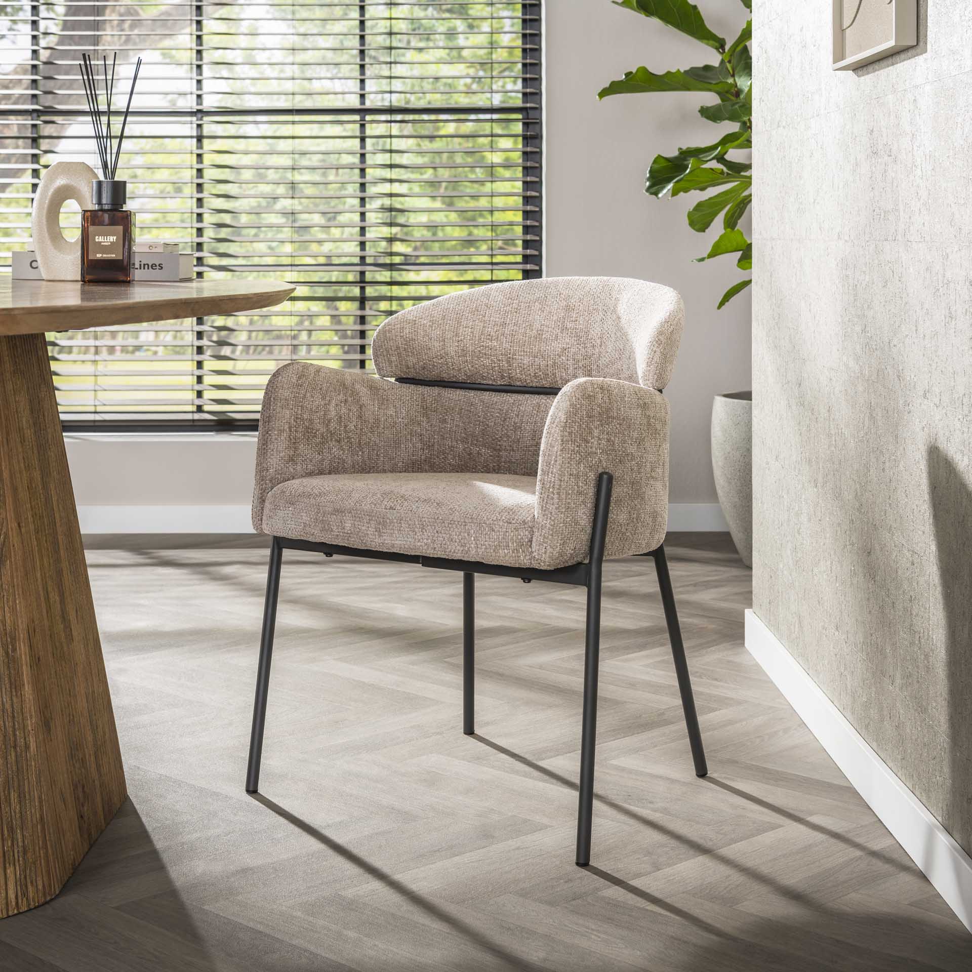 Transform your dining area with our stylish armchair with a rounded back in a beautiful sand color. This armchair offers not only comfort but also a modern look that fits into any interior.