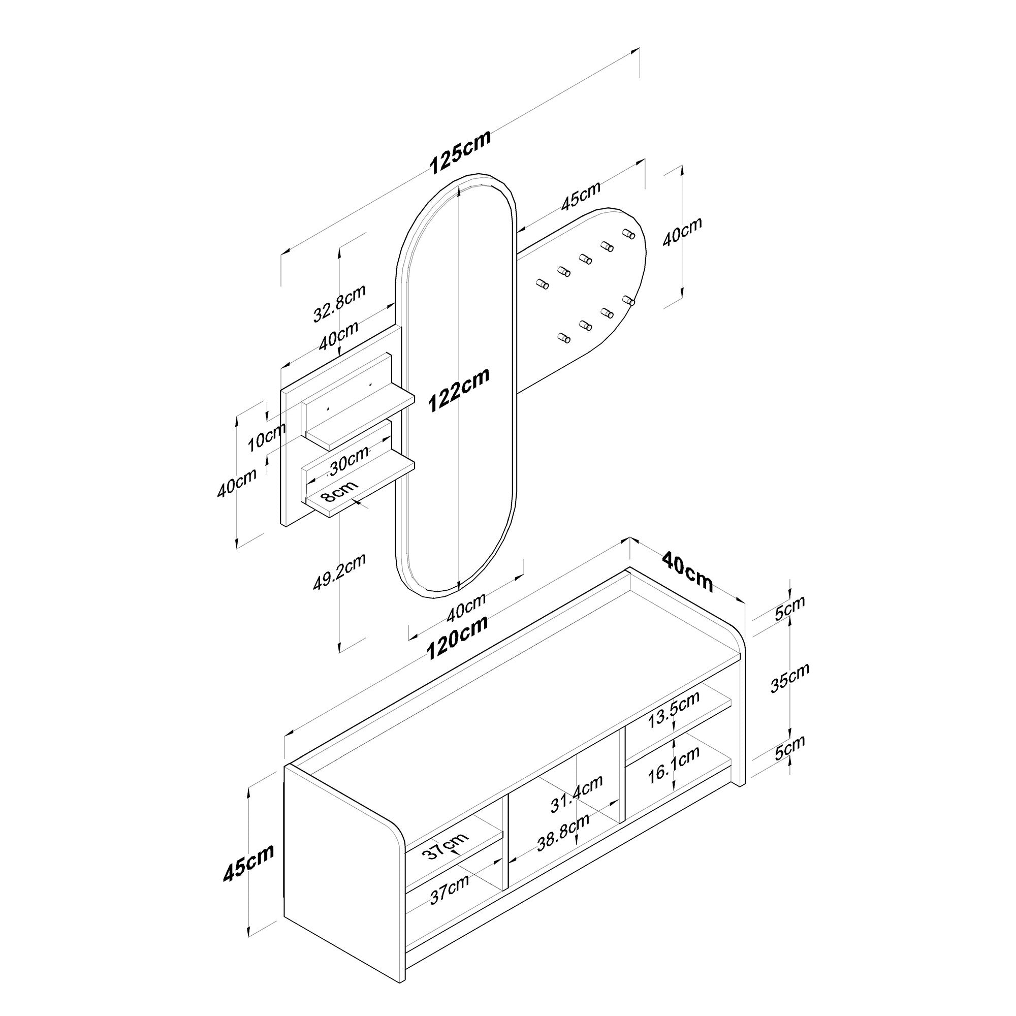 Description and specifications of Furniture set Coat rack - Mirror - Shoe cabinet - White-Walnut Melamine
