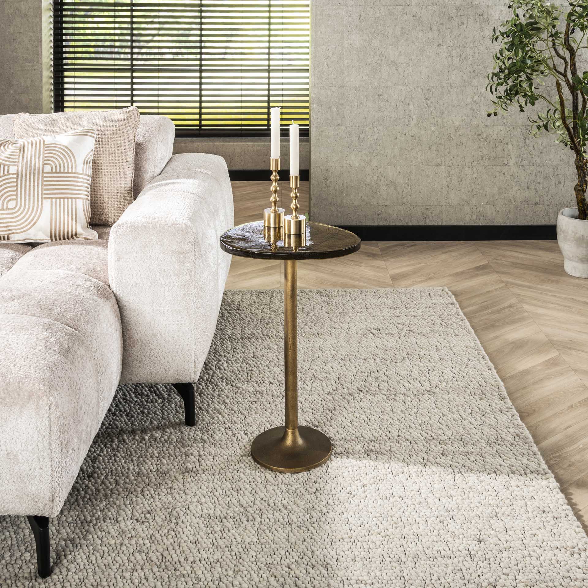 Complete your seating area with the Nola side table. The warm antique gold finish gives any interior a luxurious touch, while the sleek silhouette takes up little space. Perfect next to the sofa, as a plant table, or to showcase your favorite home accessories. Thanks to the compact shape, you can easily slide Nola wherever extra style and functionality are needed.