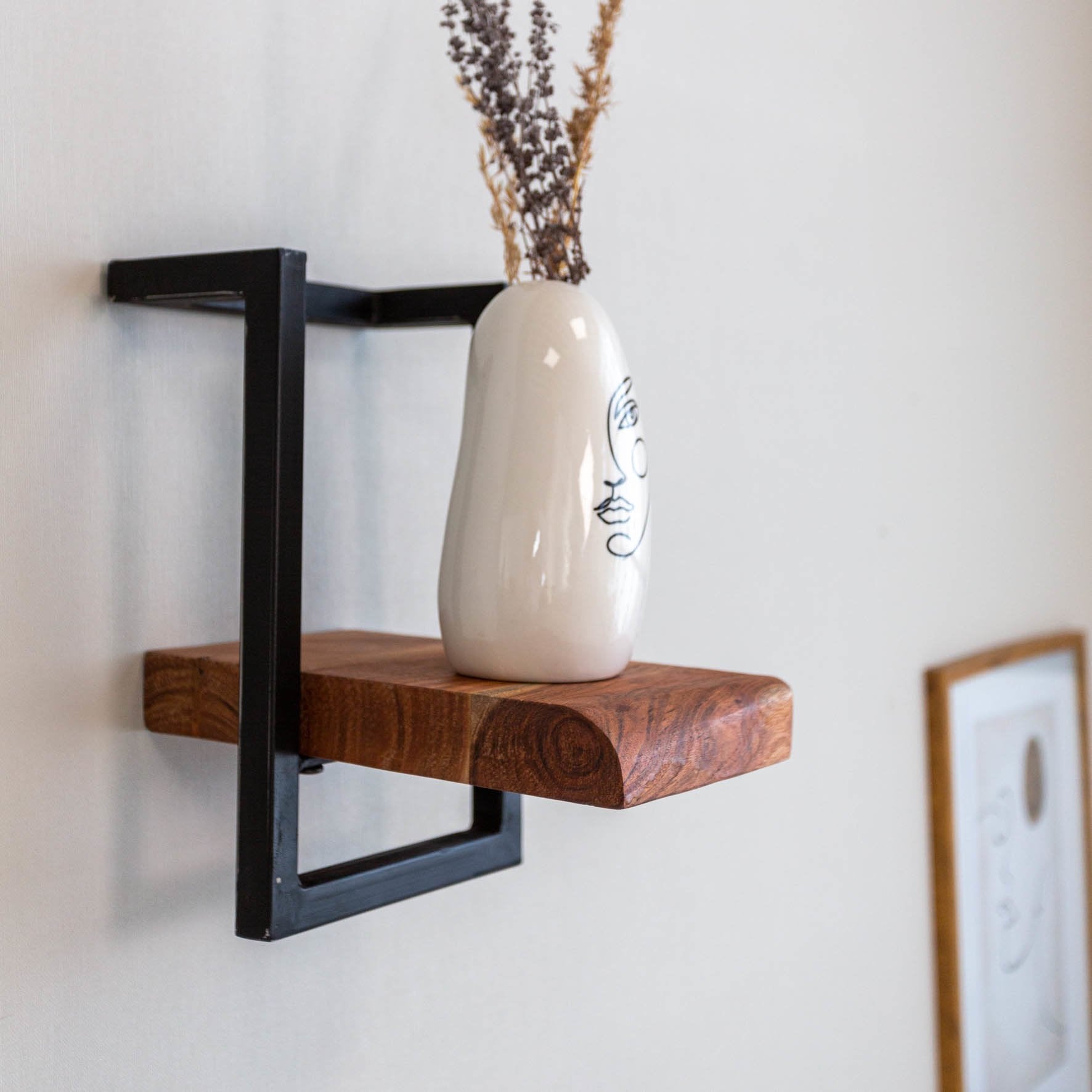 The Aberdeen wall shelf is made of acacia wood. Acacia is a particularly sustainable hardwood species. Especially the fine grain, the flame drawing and the changing hues give the board a solid and warm appearance. The wall shelf is handmade and robustly finished, so that irregularities can occur in shape and color.
