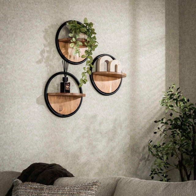 This set of 3 round wall shelves is made of solid acacia wood and immediately adds warmth and character to your home. The compact 35 cm shelves are ideal for displaying decorations, plants, or small books and seamlessly fit into various interior styles. Because it is a set, you can easily create a cohesive wall arrangement or a playful trio.